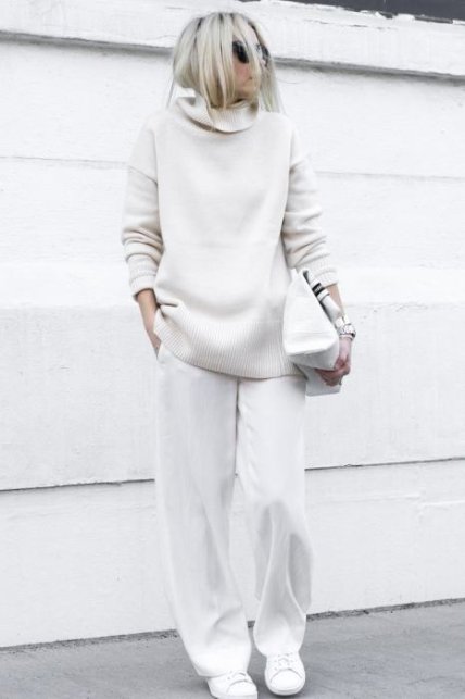 Следующее решение в минимализме – тотальный белый аутфит. Цвет олицетворяет собой легкость и воздушность, позволяет выглядеть элегантно и в то же время богемно. Он идет абсолютно всем, так как имеет множество оттенков и можно подобрать тон, наиболее подходящий к внешности. Бытует мнение, что белый полнит, поэтому многие боятся включать его в свой гардероб. На самом деле, такой эффект легко нивелируется правильным подбором фасона. Чтобы показать фигуру в лучшем свете, нужно подобрать оптимальное сочетание широких, свободного кроя вещей с зауженными и приталенными предметами одежды. Единственный недостаток белого аутфита – это его маркость. Но необходимость пристально следить за чистотой наряда с лихвой компенсируется утонченно-шикарным видом.