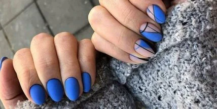 Матовый маникюр в синем цвете великолепно смотрится с геометрическими узорами. При этом в дизайн добавляется белый, розовый, черный цвет.