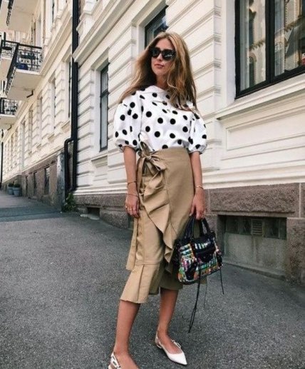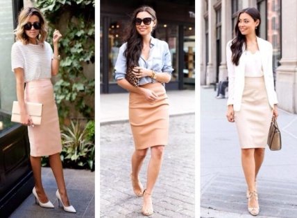 Длина чуть ниже колена на месте сужения голени не является строгим запретом для девушек невысокого роста. Отличным выбором будет такая однотонная юбка А-силуэта с посадкой на талии и вертикальным рядом пуговиц. Карандаш, крой на запах или плиссировка тоже в числе удачных решений. Пояс или ремень для акцента на талии также будут не лишними.