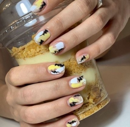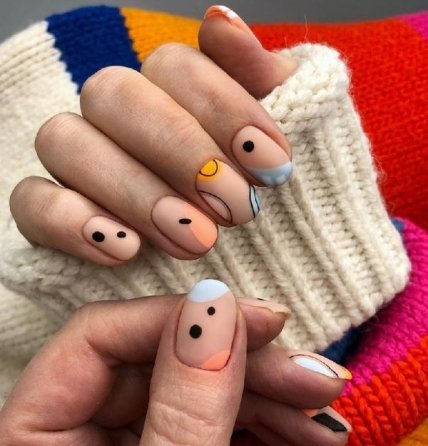 Используйте в качестве базы для потрясающего маникюра 2020 весна лак желтого, оранжевого, розового, голубого оттенка. А потом добавляете модную фишку – черные точки у основания каждого ноготка.