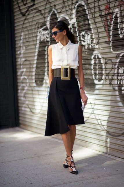 Еще один вариант, который хорошо зарекомендовал себя в качестве решения проблемы – цветовой контраст. Ваша цель – составить ансамбль таким образом, чтобы верхняя часть была намного светлее нижней. Беспроигрышным аутфитом станет белый верх и черный низ. Например, рубашка и юбка-карандаш.