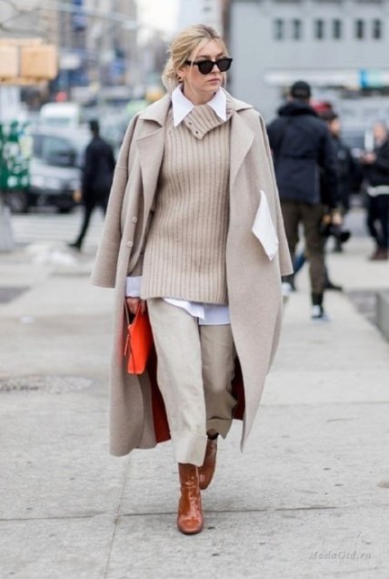Еще один вариант, который больше подходит стройным представительницам прекрасного пола. Свитер крупной вязки в стиле оверсайз визуально увеличивает грудь и делает верхнюю часть фигуры горазд объемнее, чем она есть на самом деле. В случае с худенькими девушками, эта особенность играет только на руку, так как придает образу трогательности, хрупкости и женственности. А вот полным дамам лучше не рисковать – свитера оверсайз добавят лишних килограммов в области талии, что совершенно недопустимо.