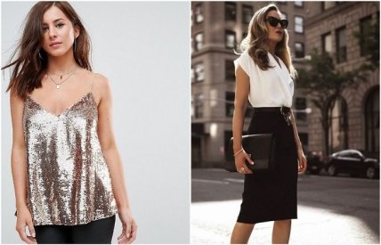 Блуза с пайетками и контрастные цвета в одежде увеличивают грудь.