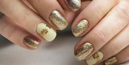Для упрощённого варианта есть специальные лаковые покрытия, которые имеют в своем составе мелкие частички золотого блестка. Также можно поэкспериментировать с присыпкой из глиттера.