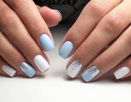 Блестки в нейл-дизайне с использованием голубых и белых лаков также приветствуются.