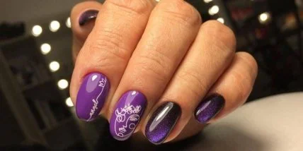 Такой маникюр выглядит достаточно броско и неординарно. На фиолетовой основе будут гармонично смотреться легкие растительные мотивы. При таком дизайне можно смело использовать различные оттенки фиолетового цвета. А вот при выборе зеленого лучше всего выбирать нефритовый, мятный, изумрудный или темно-зеленый тон.