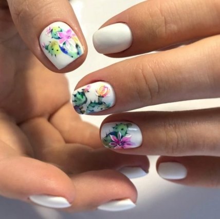 Очень популярным направлением стал художественный nail-арт на белом фоне. Белый гель-лак используется, как белый холст, на котором создаются контрастные тематические рисунки.