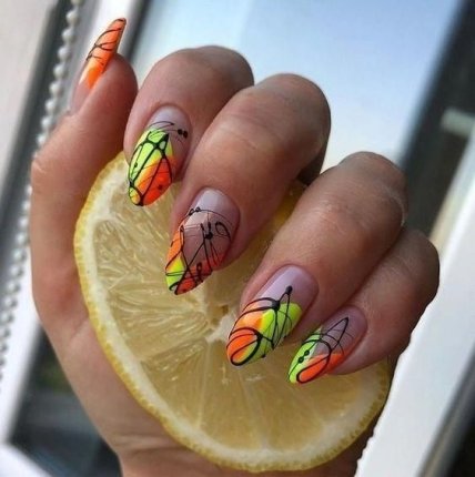 Тенденции маникюра лето 2020 включают интересные варианты сочетания градиента и рисунков.