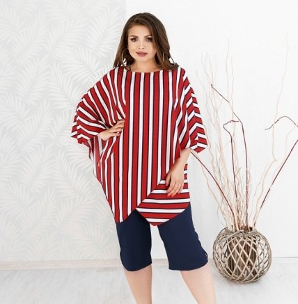 Смело выбирайте такой комплект в светлой гамме с полосатым принтом или в насыщенной однотонной расцветке. Единственное, чего стоит избегать, так это атласных или шелковых тканей, которые сосредотачивают внимание на лишних объемах.