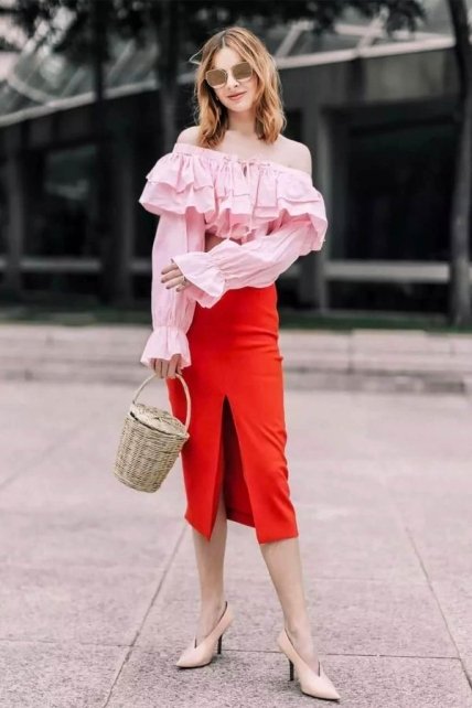 Трудно не заметить девушку, которая составила лук из приталенной блузы, юбки солнце длины миди и изящной обуви на каблуках. Такой образ вне времени, ведь он обладает невероятным французским шармом, который всегда в почете у прекрасной половины человечества. Если же вы хотите добавить в этот лук нотку трендов, подбирайте блузу с ультрамодным фасоном на запах или с открытыми плечами.