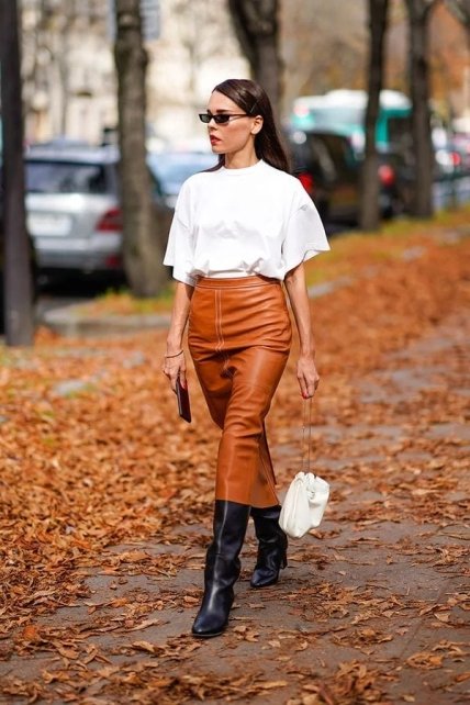 Даже привычная блуза может приобрести новое звучание, если сочетать ее с трендовым кожаным низом. Любая модница вправе подобрать вариант по душе, будь то брюки, шорты или юбка. Мода 2020 сезона предлагает поддаваться искушению и комбинировать различные фактуры в одном образе. Стильная подсказка: плотная и грубая кожа наиболее выигрышно будет смотреться в дуэте с изящным и женственным верхом. Например, в таком стильном образе можно задействовать актуальную прозрачную блузу или модель с воланами или бантом у шеи.