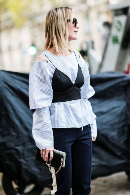 Свежая идея многослойности для любительниц экспериментов – это союз однотонной блузы и кроп-топа. Самые уверенные в себе модницы могут при этом задействовать кожаные изделия – они сейчас на пике популярности!