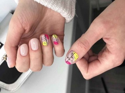 На ярком фоне очень красиво смотрятся аккуратные сочетания перепелиного узора с графическими рисунками. Также дизайнеры предложили интересно комбинировать палитры и наносить на каждый пальчик лак другого цвета.