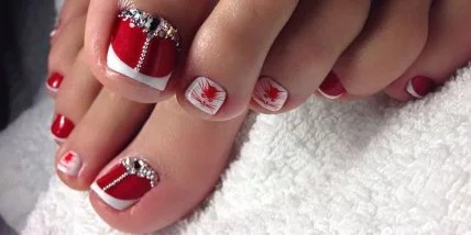 Ногти на ногах могут быть украшены не менее ярко, чем на руках. Женщины, которые любят выделять свой безупречный вкус выполняют дизайн в красном цвете и добавляют несколько страз. Объемный педикюр будет выгладить сногсшибательно, подчеркнет стильный образ женщины. Используются стразы красного цвета, так и другие более контрастные оттенки блестящих элементов. Педикюр со стразами не должен быть в слишком большом количестве, иначе выпуклые детали будут мешать, поэтому мастера выделяют один большой ноготь и создают невероятно изысканный дизайн.