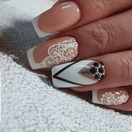 Маникюр с кружевом всегда смотрится изящно и дорого. Нанести такое украшение можно при помощи кисти или же использовать специальные трафареты с различными кружевными узорами. Любой из результатов удивит свою обладательницу. Кружевную роспись в белом цвете чаще всего выбирают невесты для свадебного маникюра.