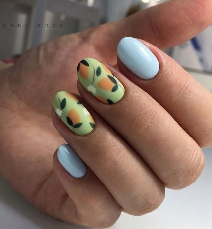 Лето – самое время для сочных долек фруктов на ноготках. Такое украшение маникюра станет «вкусным» и ярким акцентом. Очень часто выполняют один небольшой фрукт в уголке ноготка или же можно выполнить его в большом масштабе на всю ногтевую пластину.