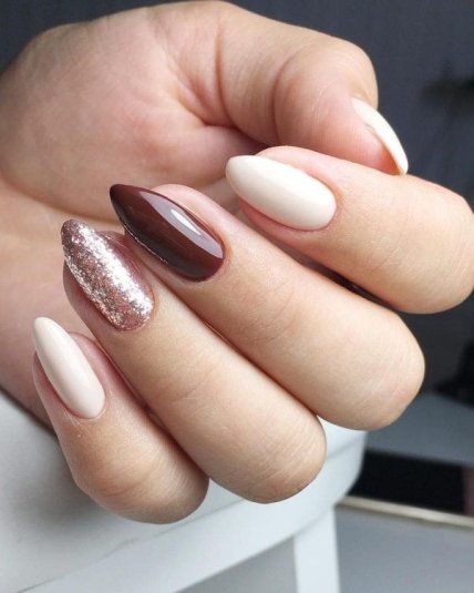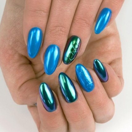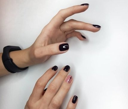 Это может быть втирка, песок, камифубуки и стразы. Достаточно оригинально выглядит маникюр с разным дизайном на обеих ручках.