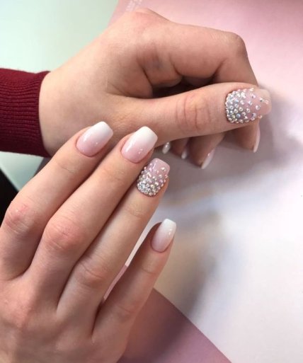 Если хочется выполнить праздничный маникюр, то используйте мелкий глиттер, который придаст образу блеск и торжественность. На короткой длине очень красиво и модно смотрится плавный переход цветов в технике омбре.