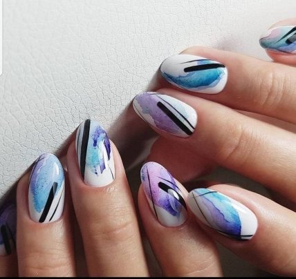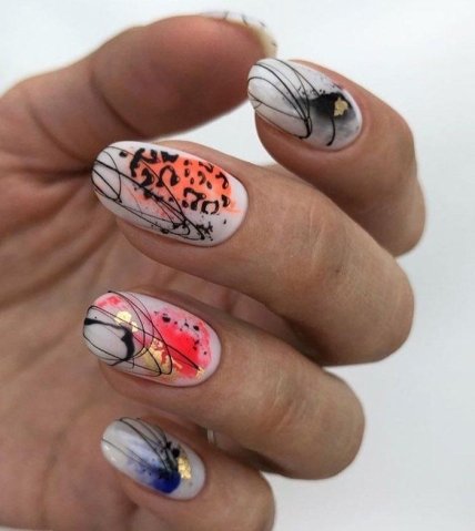 Даже девушки, работающие в офисе, с особыми требованиями дресс-кода могут с легкостью позволить себе данный стиль маникюра. Дизайн в виде полос невероятно нежно и красиво гармонирует на короткой длине ноготков. Ну, а для праздничного лука можно всего лишь украсить тонкие линии хаотичного расположения несколькими стразами или бульонками. Для выполнения тонких линий и полос мастера используют тонкую кисть или готовые наклейки.