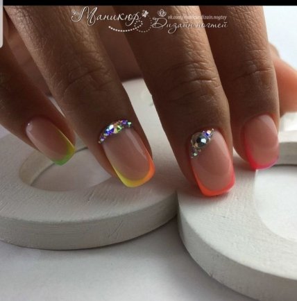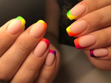 В 2020 году летний маникюр не обошелся без френча. Единственное его более усовершенствовали при помощи контрастных и сочных тонов. Данный эксперимент касается не только линии улыбки, а и основного оттенка лакового покрытия.