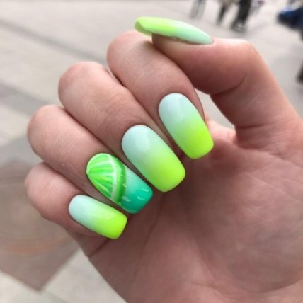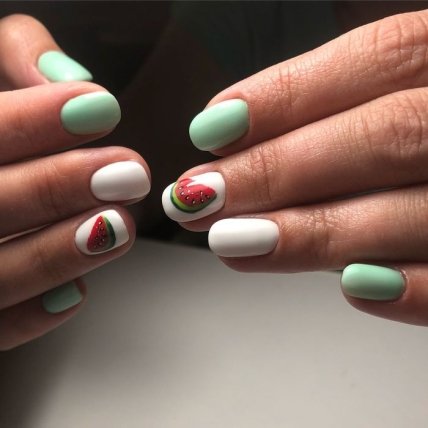 Даже маленькая долька арбуза или лайма способна привлечь к себе особое внимание окружающих. Яркие и сочные оттенки орнамента идеально сочетаются с солнечной погодой. Фруктовый дизайн невероятно красиво смотрится короткой длине ноготков.