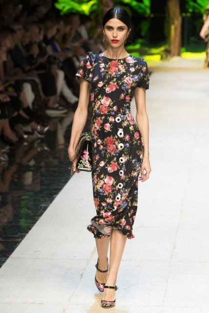 Принты на черном фоне – прекрасная возможность скрыть недостатки фигуры. Сочетание цветочного принта и черного цвета выглядит завораживающе и несколько интригующе. В моде короткие модели с однотонной юбкой и цветочным верхом, длинные модели с крупными узорами.