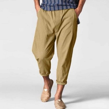 Желательно лёгкие, хлопковые или льняные. Допускается их лёгкая помятость. Она дополнительно создает эффект летней небрежности на отдыхе у берега моря или у океана. Фасон брюк — обязательно прямой, свободный. Иногда можно использовать модели с небольшой зауженностью к низу.