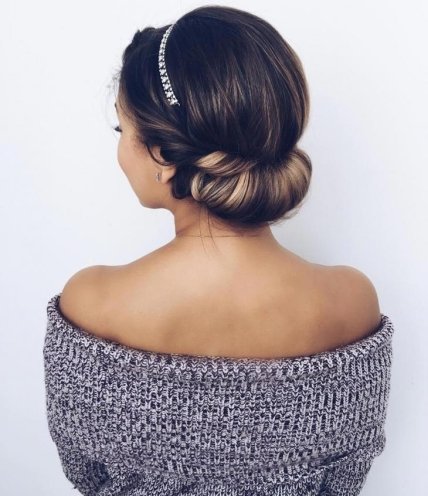 Скрутите волосы в жгуты по бокам и соберите в низкий пучок. Вам поможет ободок-резинка: подсуньте под него кончики волос для фиксации.