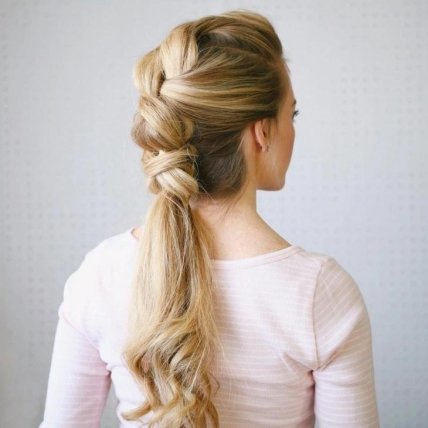 Закрутите верхнюю часть волос в свободный жгут и заколите невидимкой. Завяжите низкий хвост.