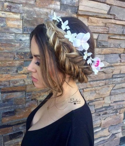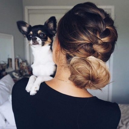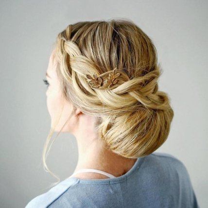 Вариант для продвинутых пользователей: оставьте свободными несколько прядей вокруг лица, остальные волосы соберите в низкий пучок, затем заплетите косу по кругу и спрячьте кончик в крепление пучка.