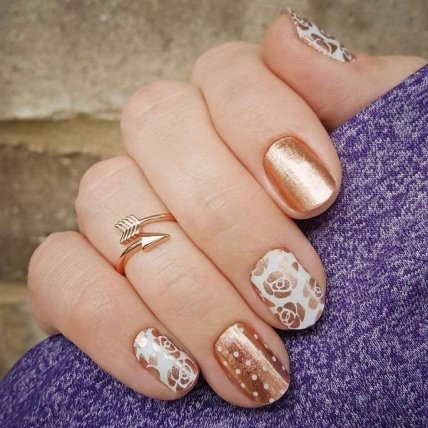 При декорировании маникюра золотыми цветами лучше всего использовать крупные рисунки. Комбинирование с цветами позволяет выполнять невероятный дизайн с дополнением в виде анималистических рисунков или геометрических фигур.