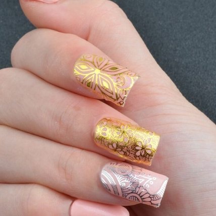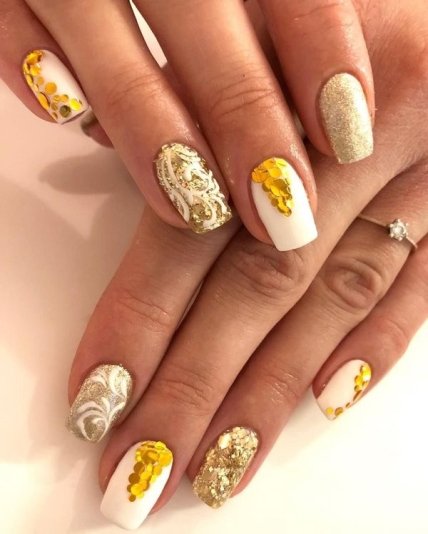 На данной основе можно выполнить невероятные сюжетные рисунки или самостоятельные бутончики золотого цвета. Оба варианта придадут дизайну игривость и изящность. Для более яркого эффекта используйте броский декор.