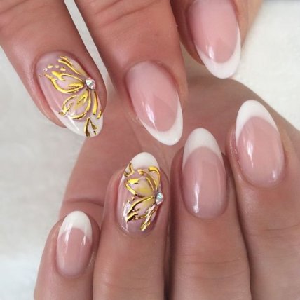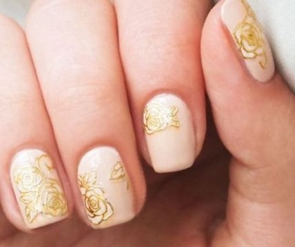 Умеренный и привлекательный нюдовый маникюр будет идеально гармонировать с очаровательными рисунками цветов, выполненными в золотом тоне на ноготках любой длины и формы.