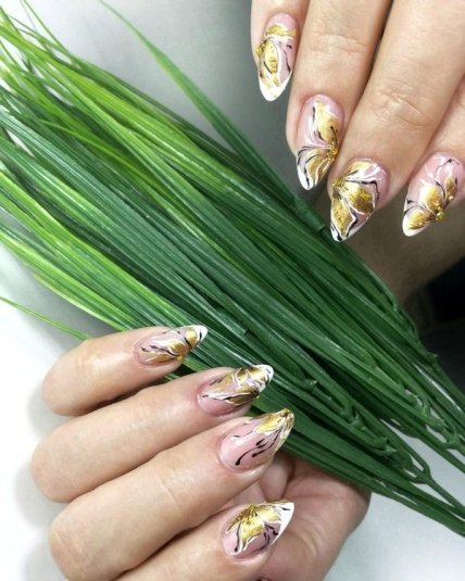 Маникюр 2020: стильные идеи дизайна с золотыми цветами (Фото)