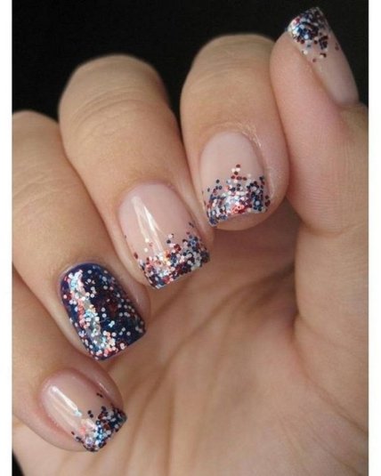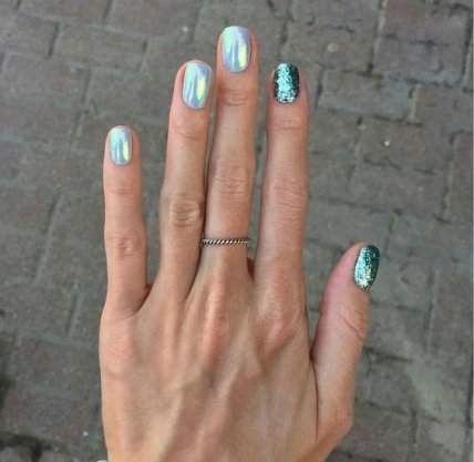 Заменить классическую белую улыбку можно и на броские блестки, ярки стразы или выполнить френч при помощи зеркальной втирки. Подобный маникюр можно смело сочетать со спокойным однотонным покрытием.