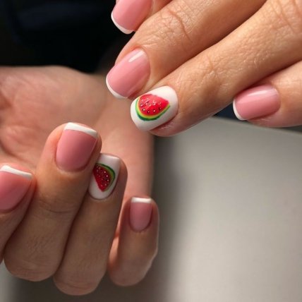 Самым подходящим временем года для выполнения сочных и ярких фруктов, безусловно, считается лето. Для того чтоб нарисовать такие аппетитные рисунки, вовсе не обязательно быть обладательницей длинных ноготков, можно воплотить свои мечты и на коротких.