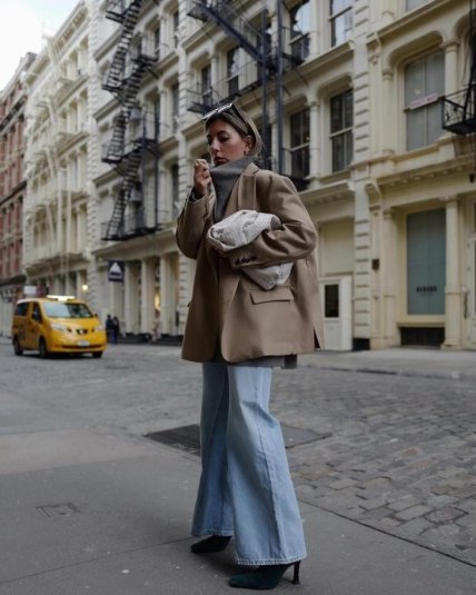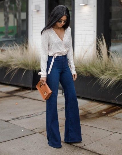 В холодное время года стройным леди можно присмотреться к джинсам клеш стиля оверсайз. Такое решение можно сочетать со свитером, ботильонами с острым носком, широким жакетом и большим клатчем.