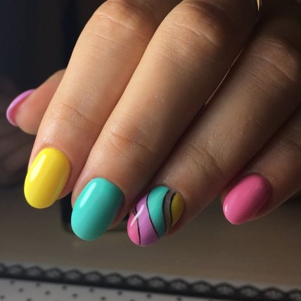 Несомненно, в летнем сезоне как никогда актуальны яркие краски. Так почему бы не попробовать что-то новое, а именно разноцветный маникюр. Его прелесть в том, что в процессе не существует никаких рамок и правил. Смешивать оттенки можно в произвольном порядке.