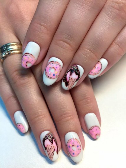 Современный маникюр порой предполагает неожиданные решения. В летнем сезоне 2020 года особенно актуальным стал "съедобный" дизайн. Мороженое с шариками, жвачки "love is", баночки "pepsi", чупа-чупсы, бокалы с коктейлями, карамельки - это лишь малая часть того, что можно изобразить на ноготках.