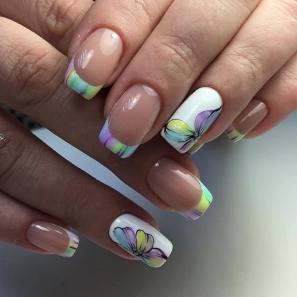 Французский маникюр уже давно не обязательно делать в классическом стиле. Выбирайте пастельные или яркие оттенки лака, меняйте форму линии улыбки и всячески экспериментируйте. Летом можно смело сочетать френч с градиентом и самыми разными рисунками.