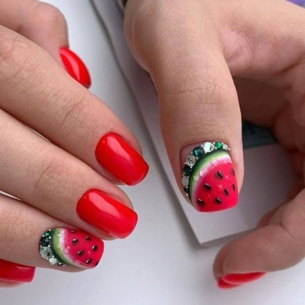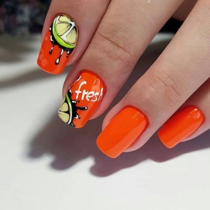 Поэтому фруктовый дизайн определенно подходит для квадратных ногтей разной длины. Главное — адаптировать рисунок, чтобы он подчеркивал красоту оформления.
