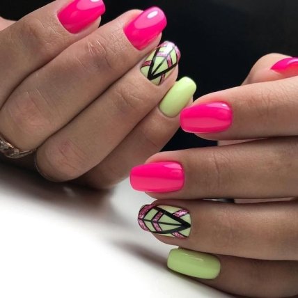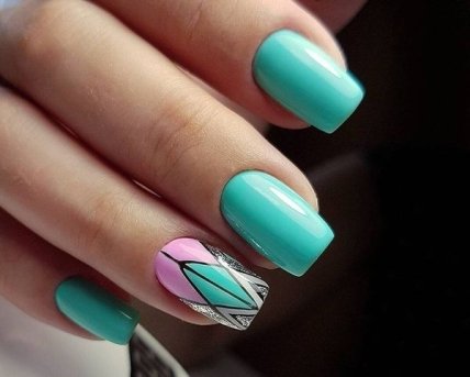 Модницы, которые предпочитают передовые новинки, определенно оценят более заметное оформление для квадратных ногтей. Это яркие оттенки лака или даже градиент в сочетании с крупным геометрическим рисунком.