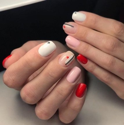 Дизайн должен быть непритязательным. То есть тонкие прямые или изогнутые линии, пунктир, точки или стрелки. В результате вы получите универсальный, практичный, но в то же время необычный маникюр.