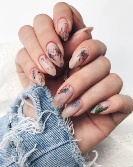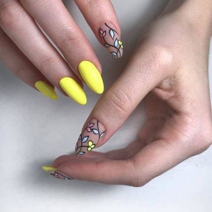 Различные бутоны, цветы и даже листики прекрасно будут смотреться на ноготках миндальной формы независимо от длины.