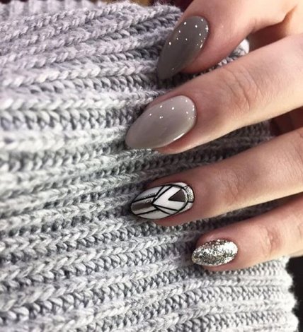 Оттенки для создания геометрического маникюра могут быть любые. Главное – правильно их сочетать, чтобы дизайн был гармоничным и подходил к повседневным образам. Декор можно использовать по желанию, причем не только мелкий, но и более крупного размера.