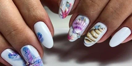 Для морского маникюра стильно и красиво, когда дизайн одного или нескольких ногтей выполнить под ракушку. Новинкой в дизайне коротких ногтей в 2020 году стал дизайн в ботаническом стиле.