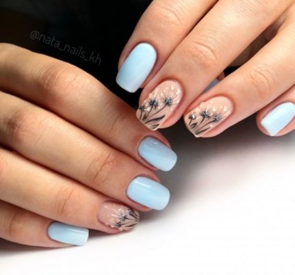 Голубой, как и синий маникюр, прекрасно сочетается со многими оттенками, как темными, так и светлыми.