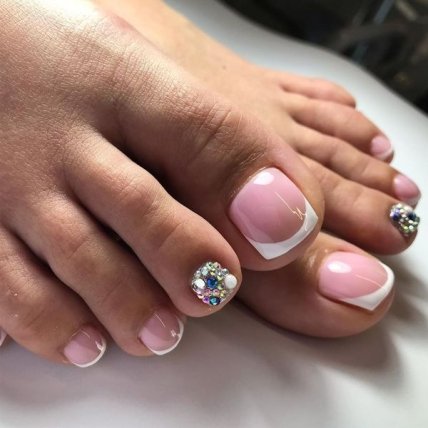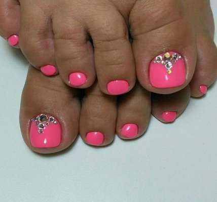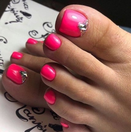 Благодаря большому разнообразию оттенков, размеров и форм стаз, любая барышня сможет подобрать идеальный для себя вариант розового педикюра со стразами. Кристаллы могут украшать всю ногтевую пластину или выделять лишь часть ноготка красивым узором. Также очень оригинально смотрятся на пальцах ног одиночные камни на каждом ноготке.