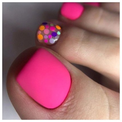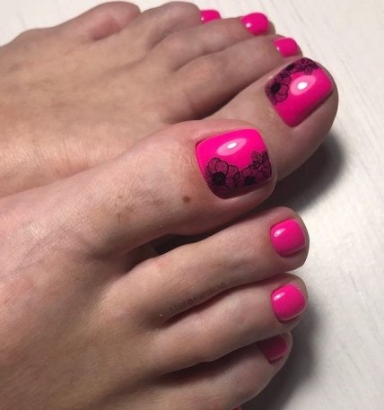 Однотонный педикюр может оформляться как с использованием декора, так и без него. В первом варианте, украшения или рисунки актуально располагать на большом акцентном ноготке.