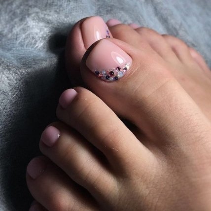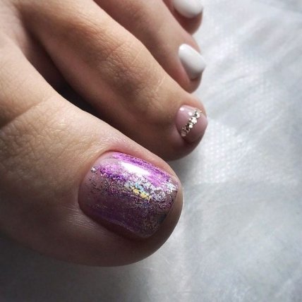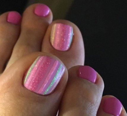 Блёстки могут дублировать основной оттенок педикюра или, наоборот, контрастно отличаться. Розовая палитра в этом варианте хорошо смотрится с фиолетовыми, красными, золотистыми и серебристыми блёстками.